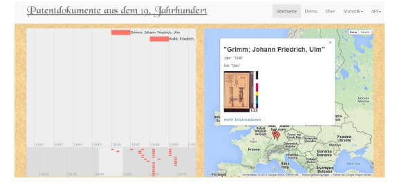 ![]() | Der Language Geekinatorizer entstand als akademisches Projekt in dem Kurs “XMLTechnologien” des Masterstudiengangs der Informatik an der FUBerlin. Ziel des Projektes war es eine WebAnwendung zu bauen, welche Daten des Coding Da Vinci Wettbewerbs verwendet ( http://codingdavinci.de/ ). Dabei sollten diverse WebTechnologien rund um XML verwendet werden. Der Language Geekinatorizer ist eine in java entwickelte WebAnwendung, welche ein Sprachquiz realisiert. Linguistische Beispielsätze werden dem Spieler präsentiert und es wird nach der Sprache des entsprechenden Satzes gefragt. Als Hilfsmittel gibt es die englische Übersetzung, sowie eine Angabe von Ländern, in denen die Sprache gesprochen wird. GitHubLink: | ![]() | Im Rahmen des Moduls „XML-Technologien“ an der Freien Universität Berlin hatten wir die Aufgabe, ein Projekt mit dem Inhalt „Open Cultural Data“ zu erstellen. Unsere Idee war es eine Webseite zu entwickeln, die Patente aus den Jahren 1840 – 1877 auf einer Google Maps Karte und einer Zeitlinie darstellt. Die Daten, die in diesem Projekt benutzt wurden, wurden aus dem Bestand E170a Württembergische Patentkommission der Zentralstelle für Gewerbe und Handel (Landesarchiv Baden-Württemberg) entnommen. Die Metadaten sind in der Coding Da Vinci Webseite verfügbar unter https://offenedaten.de/dataset/patentkommission-der-zentralstelle-fur-gewerbe-und- handel/resource/1e9297ef-34b2-4cc6-8c15-f314fa65b284. GitHubLink: |